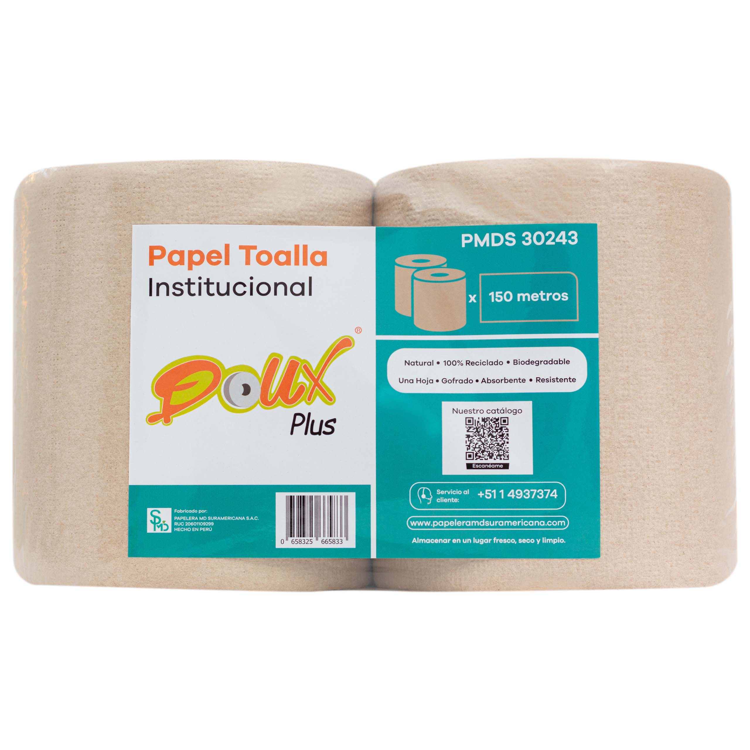 Ficha Técnica: Papel Toalla Institucional Natural Doux Plus x 150 m – Pack x 2 Rollos